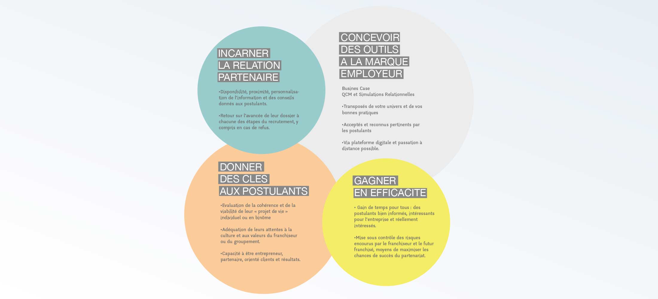 • Solutions de recrutement et d’Assessment Center internes, transmission de notre savoir-faire aux RH et Opérationnels